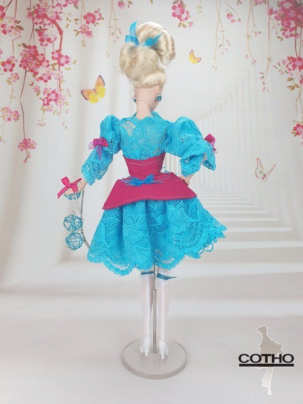 Her outfit is in fushia pink cotton, and Calais lace, made in France, in turquoise color.