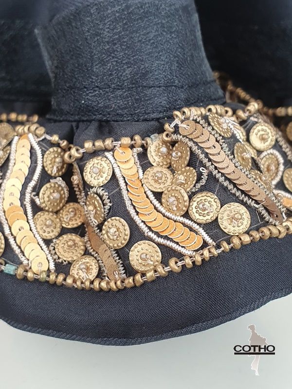 Her large dress is in black satin and organza. A vintage braid of gold-colored bead and sequin embroidery adorns the ruffles.