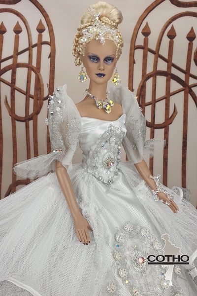 The front of her skirt is covered with splendid French Haute-Couture lace in silver thread and hand-embroidered with rhinestones, Swarovski* crystal beads, silver metal flower cups.